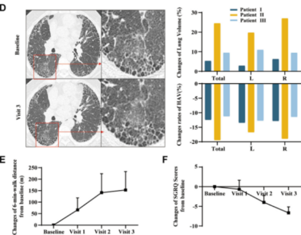 After receiving treatment, three patients with severe pulmonary fibrosis showed significant improvements in forced vital capacity (FVC) and small airway function indicators (FEF75, FEF50). High-resolution computed tomography (HRCT) scans revealed increased lung volume and reduced fibrotic areas. The patients also experienced marked relief of subjective symptoms such as dyspnea, along with substantial enhancement in quality of life. This research provides robust clinical evidence for the translational application of stem cell therapy in the field of refractory pulmonary fibrosis.
