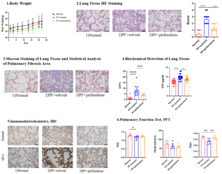 Currently, pulmonary fibrosis remains incurable in clinical practice and requires long-term intervention. Clinically, it is mainly treated with drugs such as Pirfenidone and Nintedanib; however, these drugs can only delay the decline in lung function and cannot reverse pulmonary fibrotic scars. Additionally, they may cause intolerable side effects such as gastrointestinal discomfort, resulting in a lack of diverse clinical treatment options, limited choices for patients, and inadequate therapeutic efficacy, with a prominent unmet clinical need.